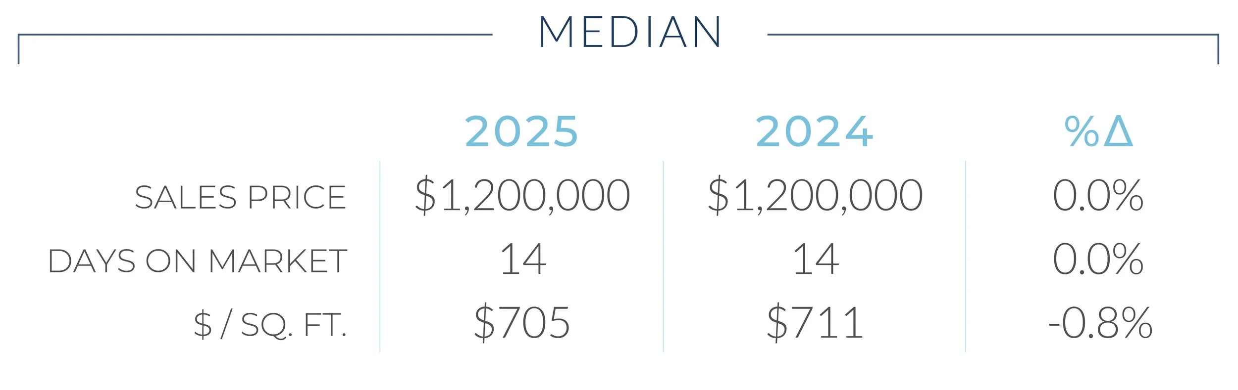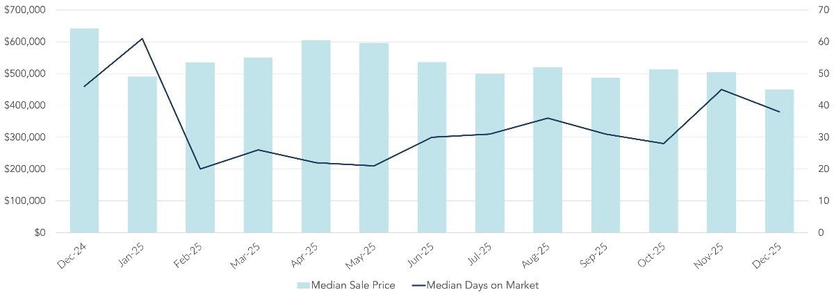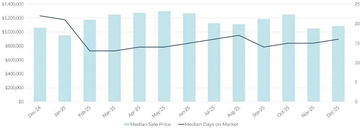 Single-family homes continued to anchor the market. The median sales price held firm at $1,200,000, and homes moved quickly, with a median of just 14 days on market. Despite a slight dip in price per square foot, activity increased modestly, with both contracts and closed sales finishing the year higher than 2024. Competition remained elevated, with nearly three-quarters of homes selling above list price and sellers receiving an average of 113.4 percent of asking, underscoring consistent buyer demand for well-located, quality properties.