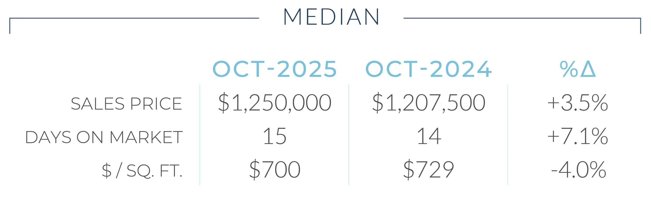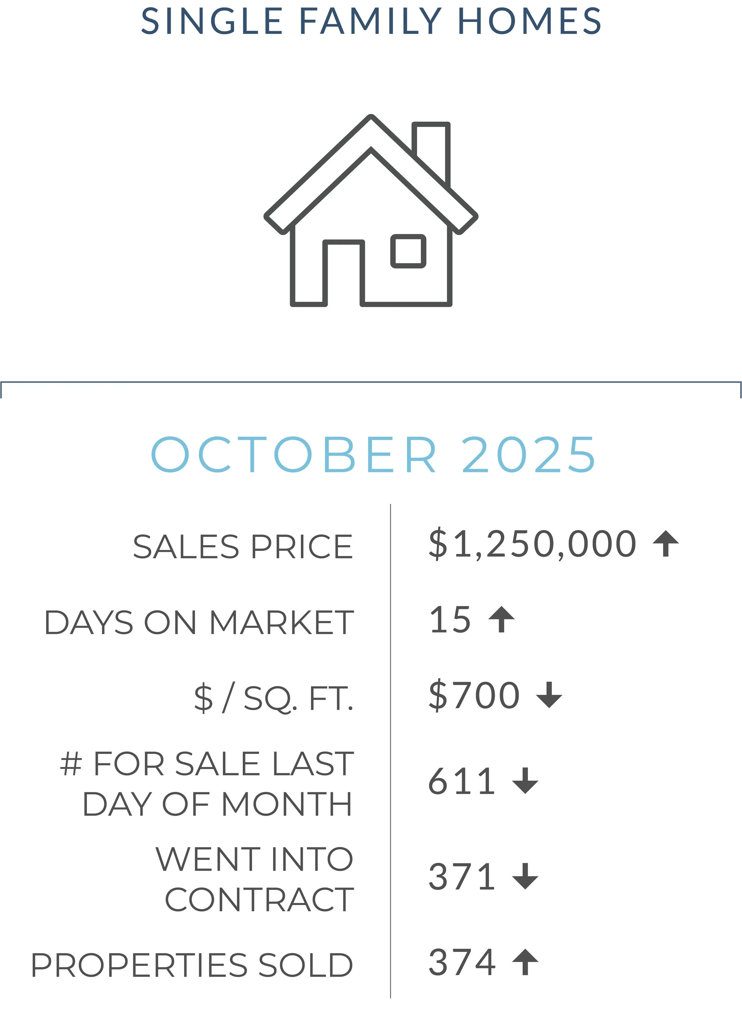 The Inner East Bay market continued to show impressive stability through October, with solid gains in home values despite modest shifts in activity. The median sales price for single-family homes rose 3.5% year over year to $1,250,000, underscoring the region’s ongoing appeal and resilience. Homes are still selling quickly, with a median of just 15 days on market, only one day longer than last year, while the number of closed sales climbed 2.2% to 374, signaling steady buyer demand even as inventory tightened.
